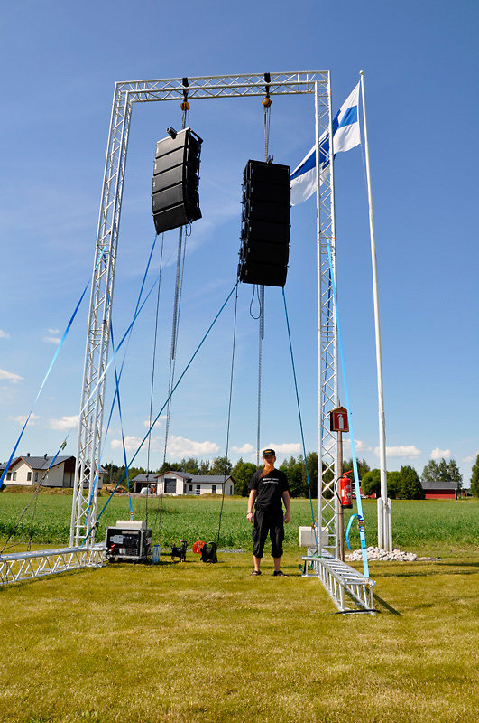 Isonkyrön juhlakentälle kaapeleiden vetäminen ja äänentoiston rakentaminen oli helppoa, sillä ympärillä ei ole rakennuksia. Lakeuden Soundin johtaja Jyrki Keskinen kertoo, että aiemmilla juhlilla ei näin helpolla ole aina päästy.