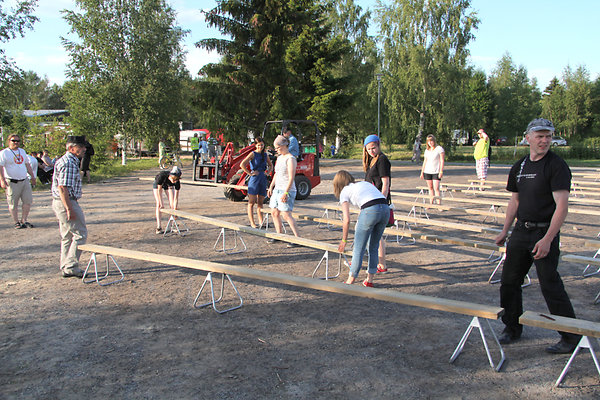 Perjantain aattoseurojen jälkeen levitettiin juhlakentälle lisää penkkejä. (Kuva: Juha Leppänen)