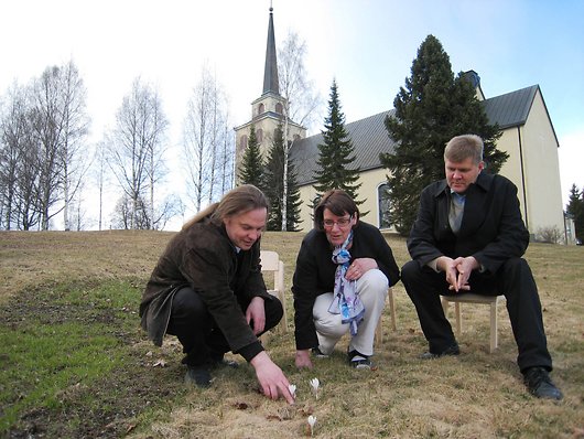 Ei mitään pikkujakkaroita, vaan oikeat seurapenkit levitetään Kiuruveden kirkon ympäristöön heinäkuussa. Äitienpäivän kynnyksellä kentällä nostavat päätään krookukset, saattoivat juhlien pääsihteeri Arja Pentikäinen sekä juhlajärjestelijä Osmo Kangas ja toiminnanjohtaja Simo Juntunen Herättäjä-Yhdistyksestä todeta. Kuva: Marjatta Pulkkinen