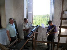 Kiuruveden kirkon torniin ei ole heikkohermoisella kiipeämistä. Sieltä tämä trio kuitenkin soittaa joka ilta juhlien aikana tutun iltavirren Mua siipeis suojaan kätke.