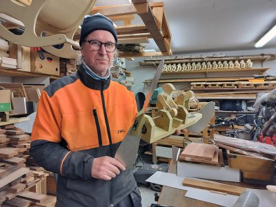 Esko Sydänmetsä on aktiivisesti mukana myös juhlien varainhankinnassa. Hänen verstaassaan valmistuu talkooporukan voimin monenlaisia hyödykkeitä myytäväksi.