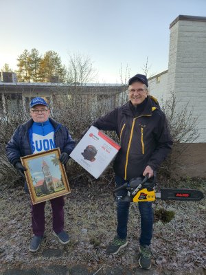 ![]() Herättäjäjuhlahuutokaupan meklarina toimii Teippiukko, Tuomo Haikola (vas.) apunaan Markku Autio. Meklarioppia on saamassa myös Petri Vähäkangas, joka ei valitettavasti ehtinyt kuvaan. |